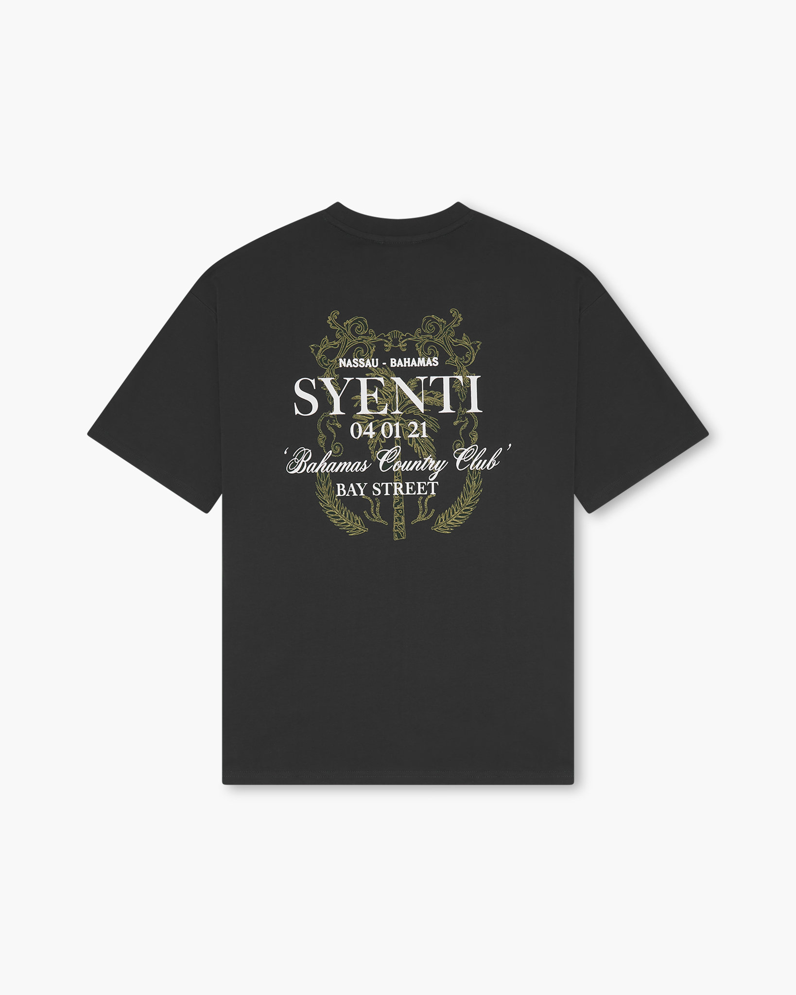 Oversized, drop shoulder short sleeve Country Club T-Shirt in Black. Composed using a 250 GSM heavy weight soft pure cotton fabric. Showcases "Bahamas Country Club" typography overlay graphic.
